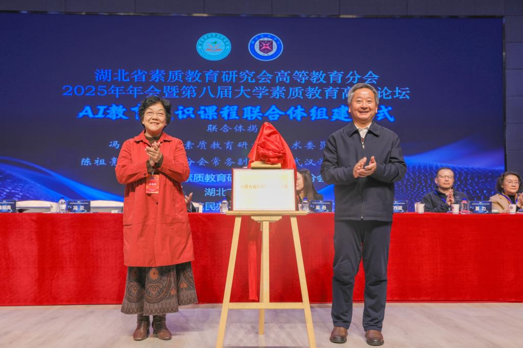 湖北省素质教育研究会学术委员会主任冯兰、高教分会常务副会长、武汉学院党委书记陈祖亮为联合体揭牌