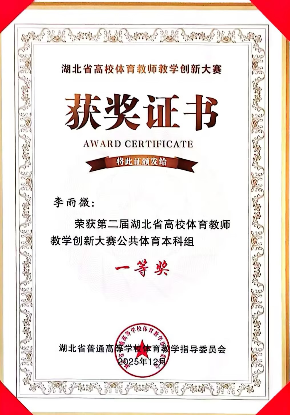 本次大赛由湖北省教育厅指导、湖北省普通高等学校体育教学指导委员会主办,赛事竞争激烈,初赛淘汰率达50%,历经网络评审与现场汇报等多环节严格考核。李雨薇团队深耕《大学瑜伽》课程教学,凭借精巧的教学设计、贴合公体课程育人目标的创新教法,在决赛现场的汇报中赢得专家认可;李艳团队聚焦《体育社会学》课程,将思政创新与专业教学深度融合,以扎实的教学实践成果在体育专业组决赛中脱颖而出。