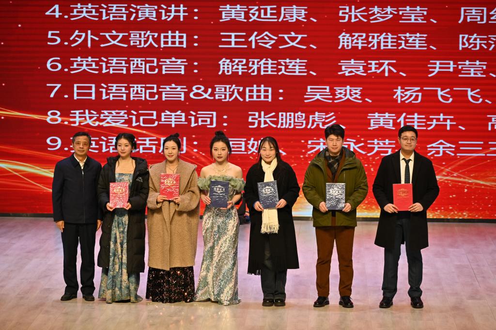 颁奖环节中,与会领导依次为在外文电影鉴赏、英语书法、英语演讲、外文歌曲、“我爱记单词”、英语话剧、英语短视频等多项赛事中脱颖而出的学生颁发荣誉证书,表彰他们在活动中的优异表现,以此激励更多学子主动参与外语实践、提升综合素养。