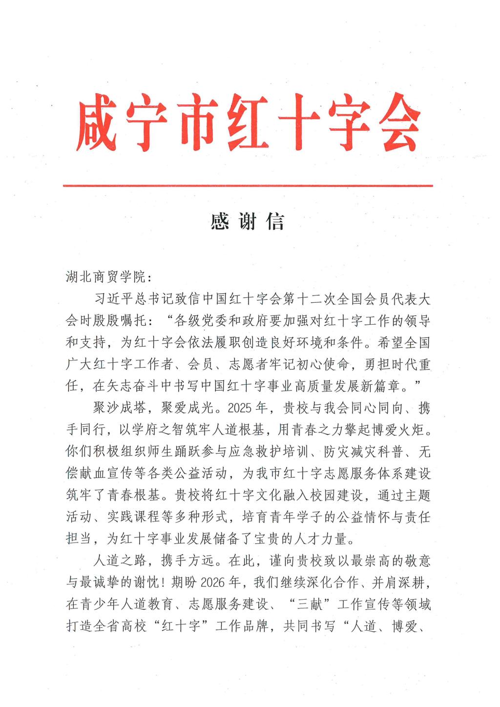 近日,我校收到咸宁市红十字会发来的感谢信,信中对学校长期以来支持志愿服务活动致以诚挚谢意。我校始终以立德树人为根本,引导学子勇担社会责任,踊跃投身于各类社会公益实践当中。
